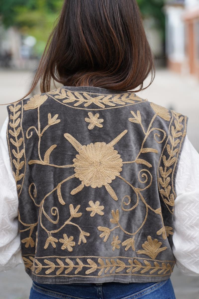 Chaleco de terciopelo con bordado a mano, interior forrado con estampado block print y detalles florales. Es cómodo y con un toque artesanal que marca la diferencia.