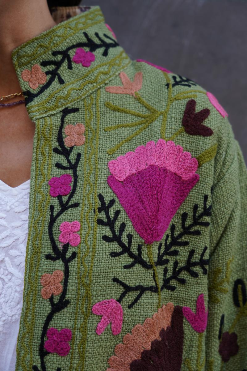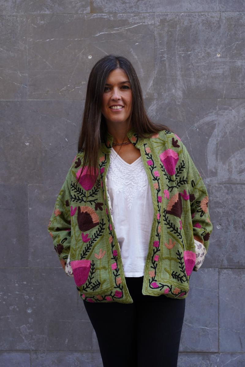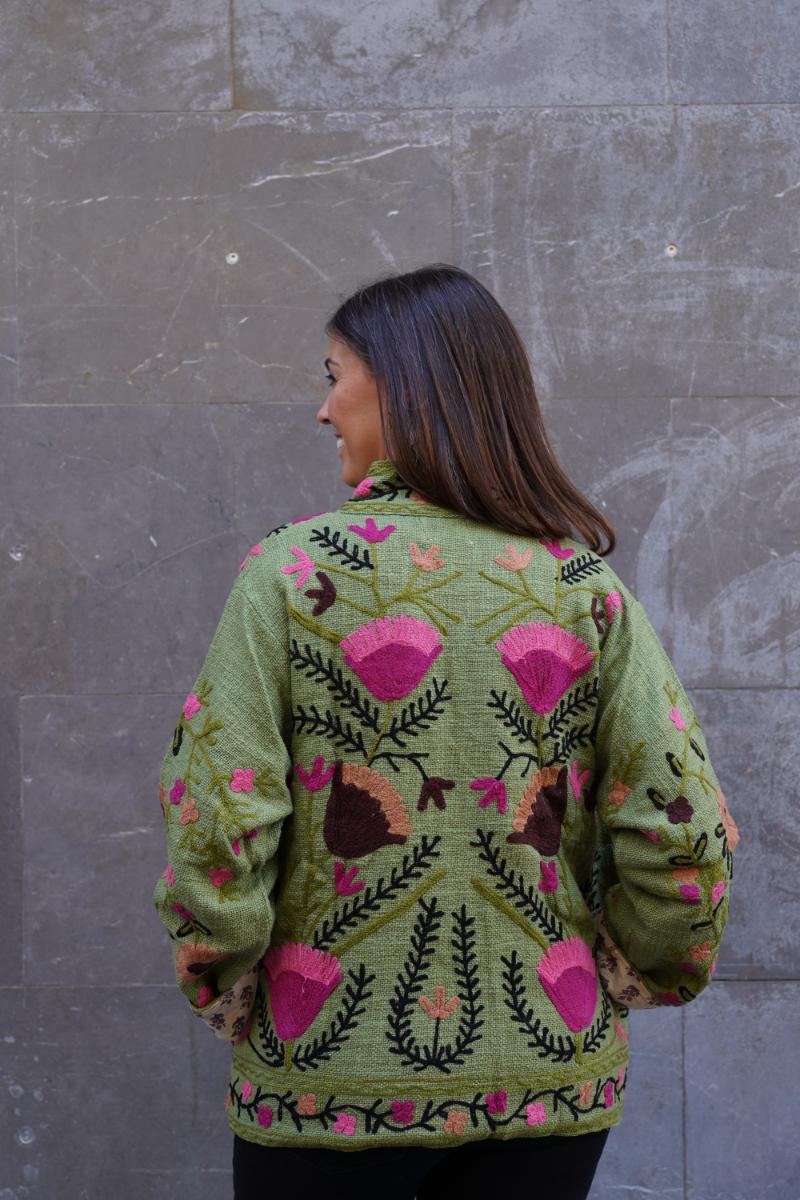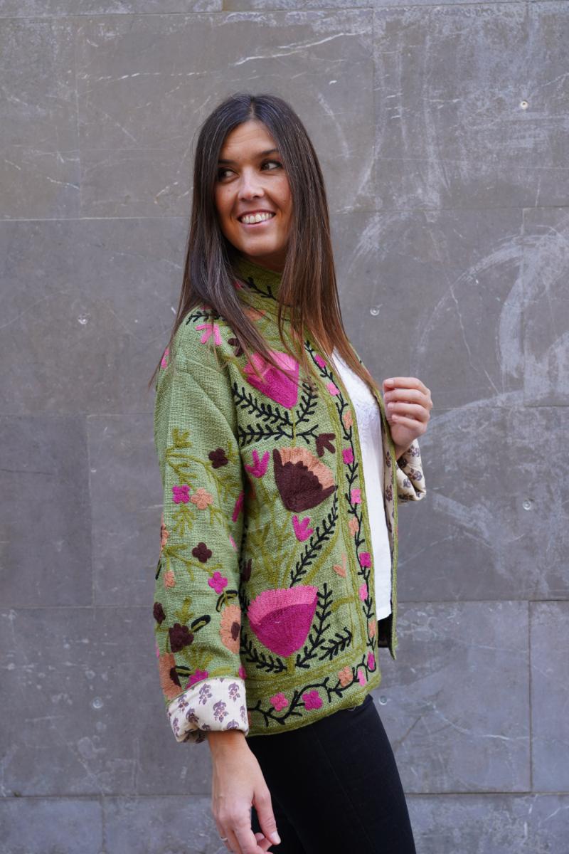 Cada chaqueta se confecciona en talleres pequeños de India, donde artesanos la bordan con cuidado y precisión. El resultado es una prenda diferente, con buenos acabados y que queda genial puesta.