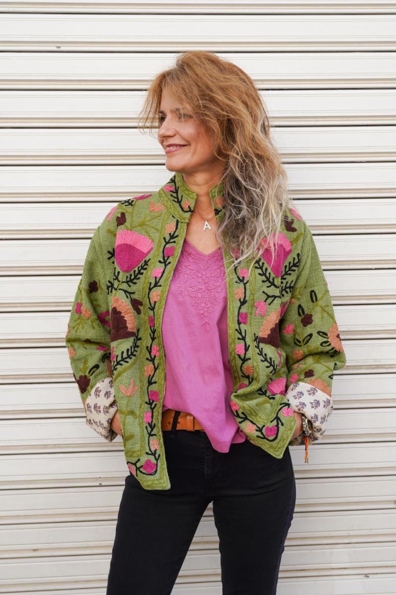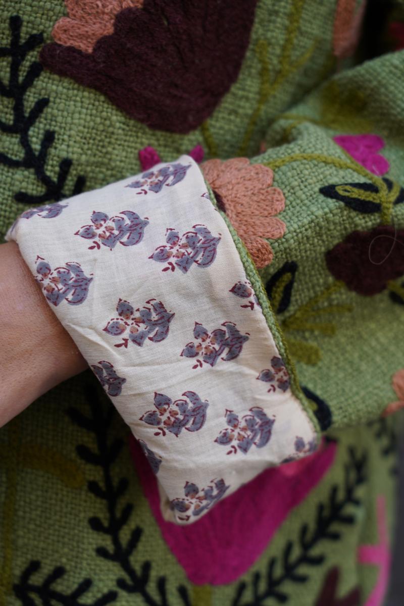 Chaqueta de algodón con bordado a mano, interior forrado con estampado block print y detalles florales. Es cómoda, abrigada y con un toque artesanal que marca la diferencia.