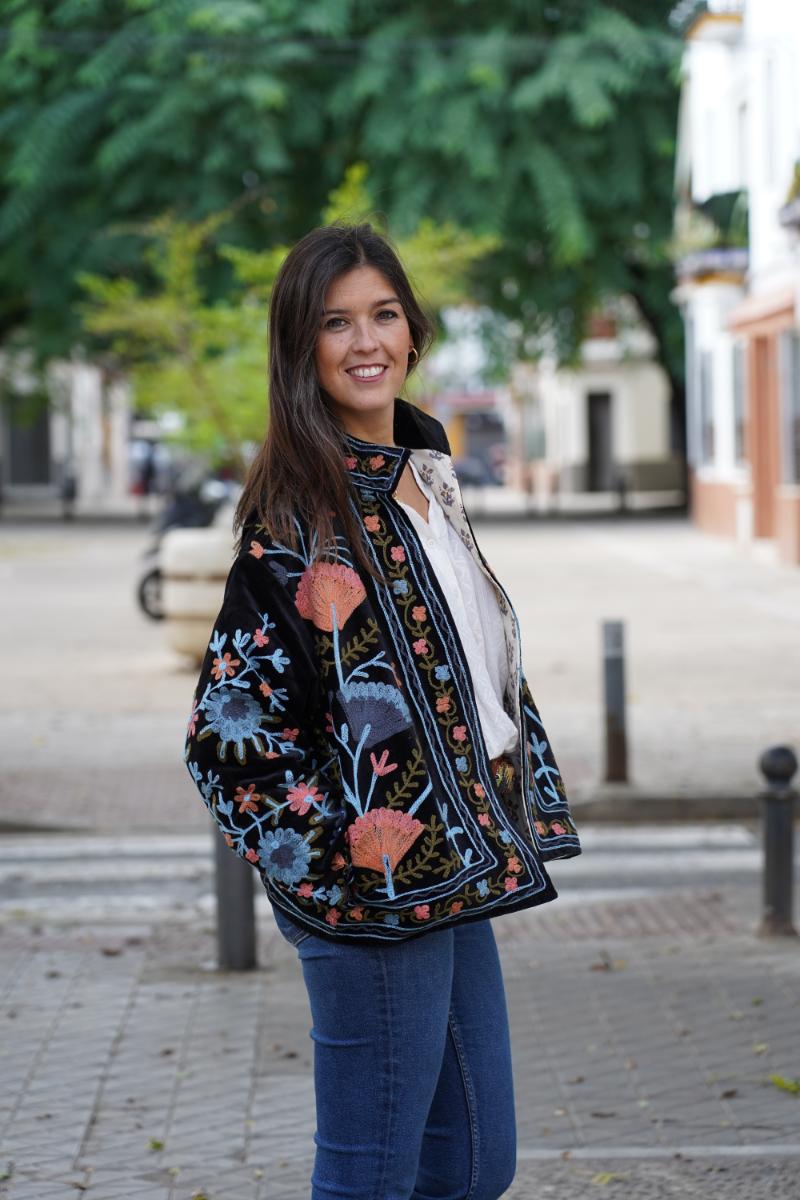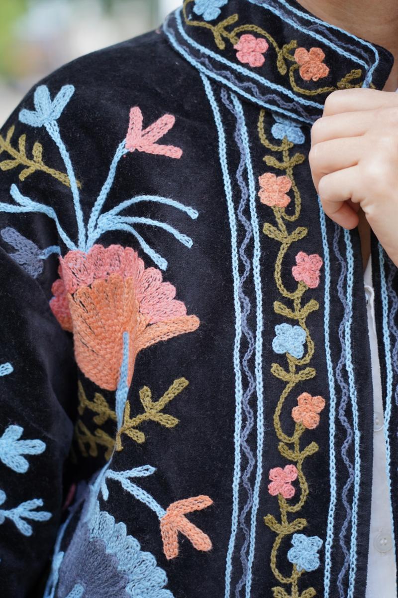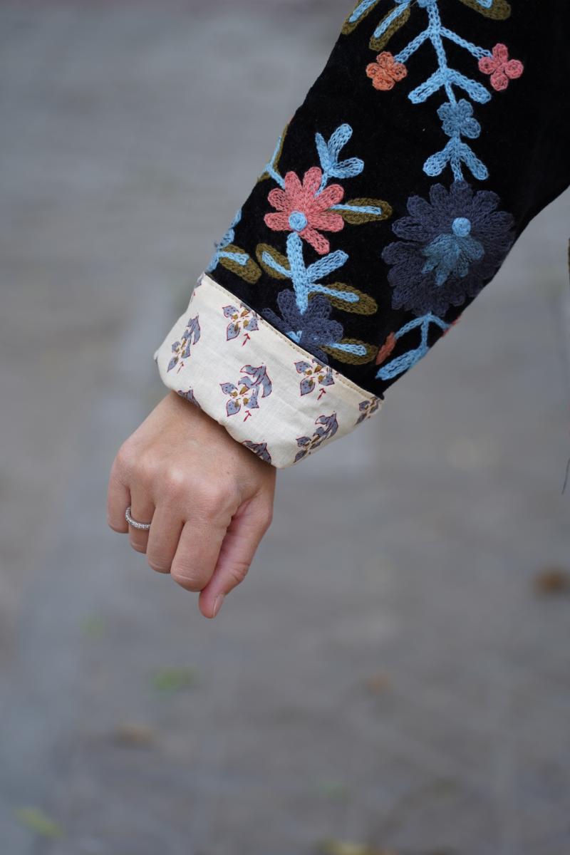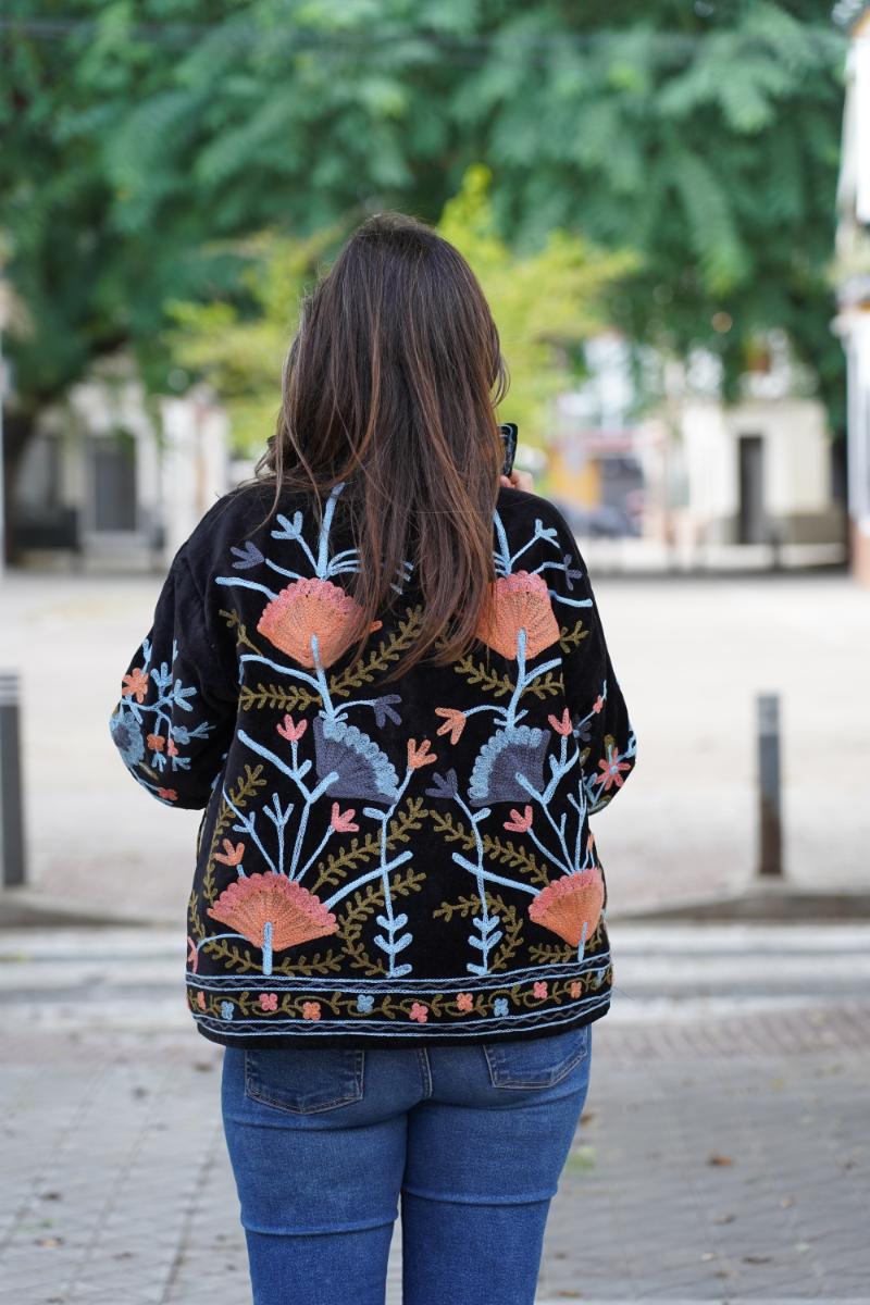 Chaqueta de terciopelo con bordado a mano, interior forrado con estampado block print y detalles florales. Es cómoda, abrigada y con un toque artesanal que marca la diferencia.