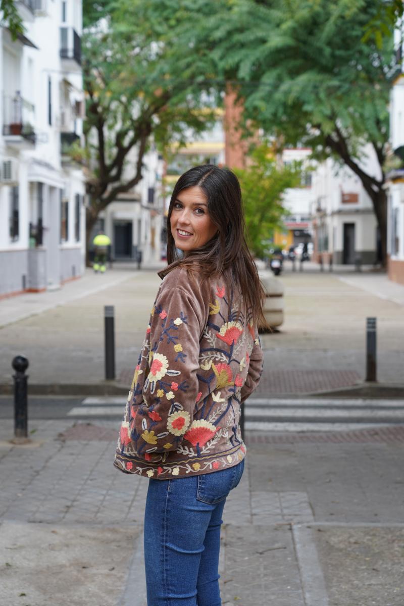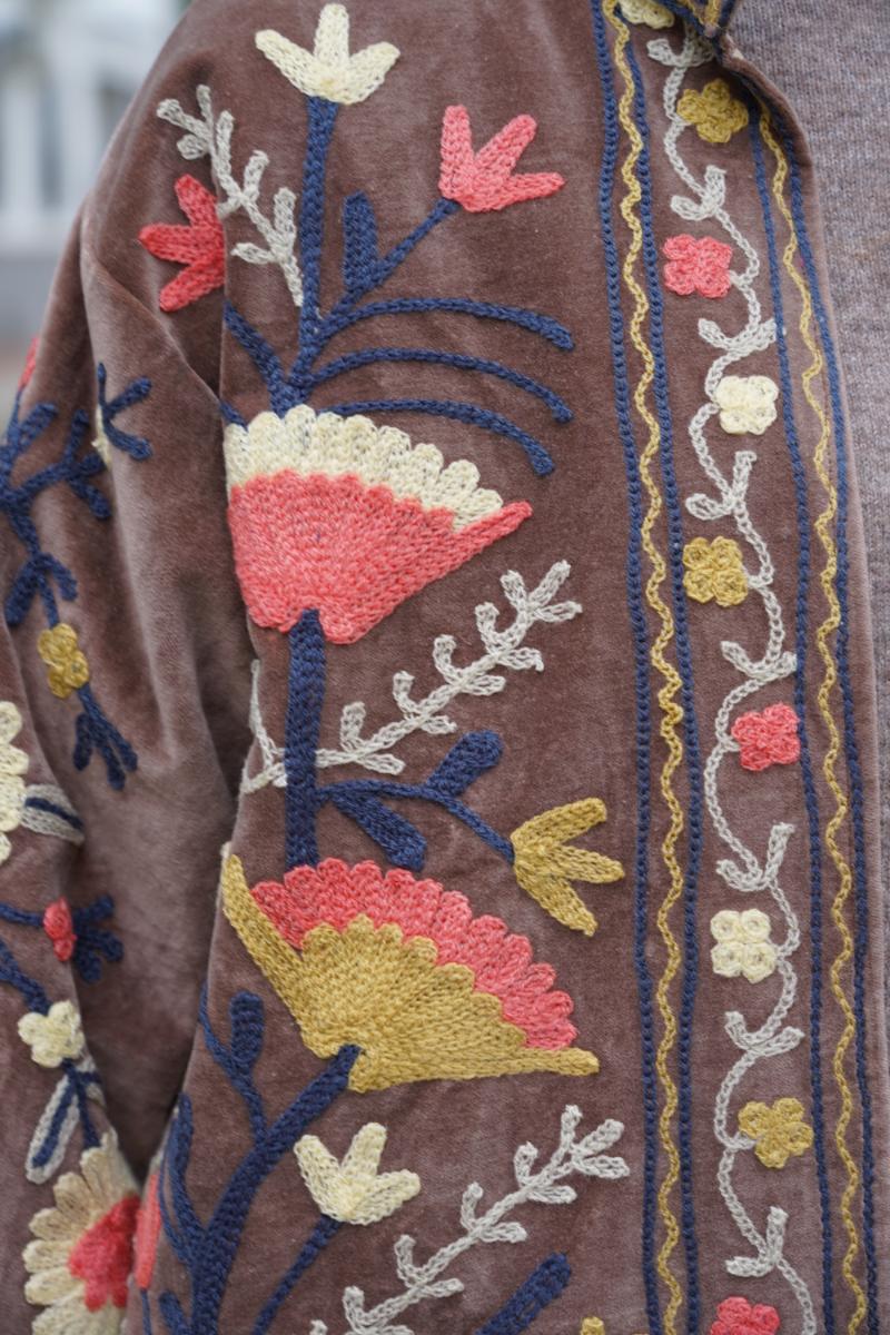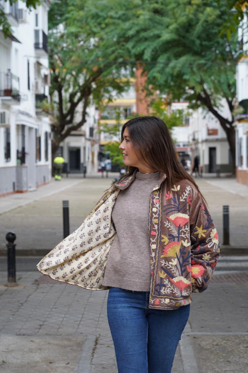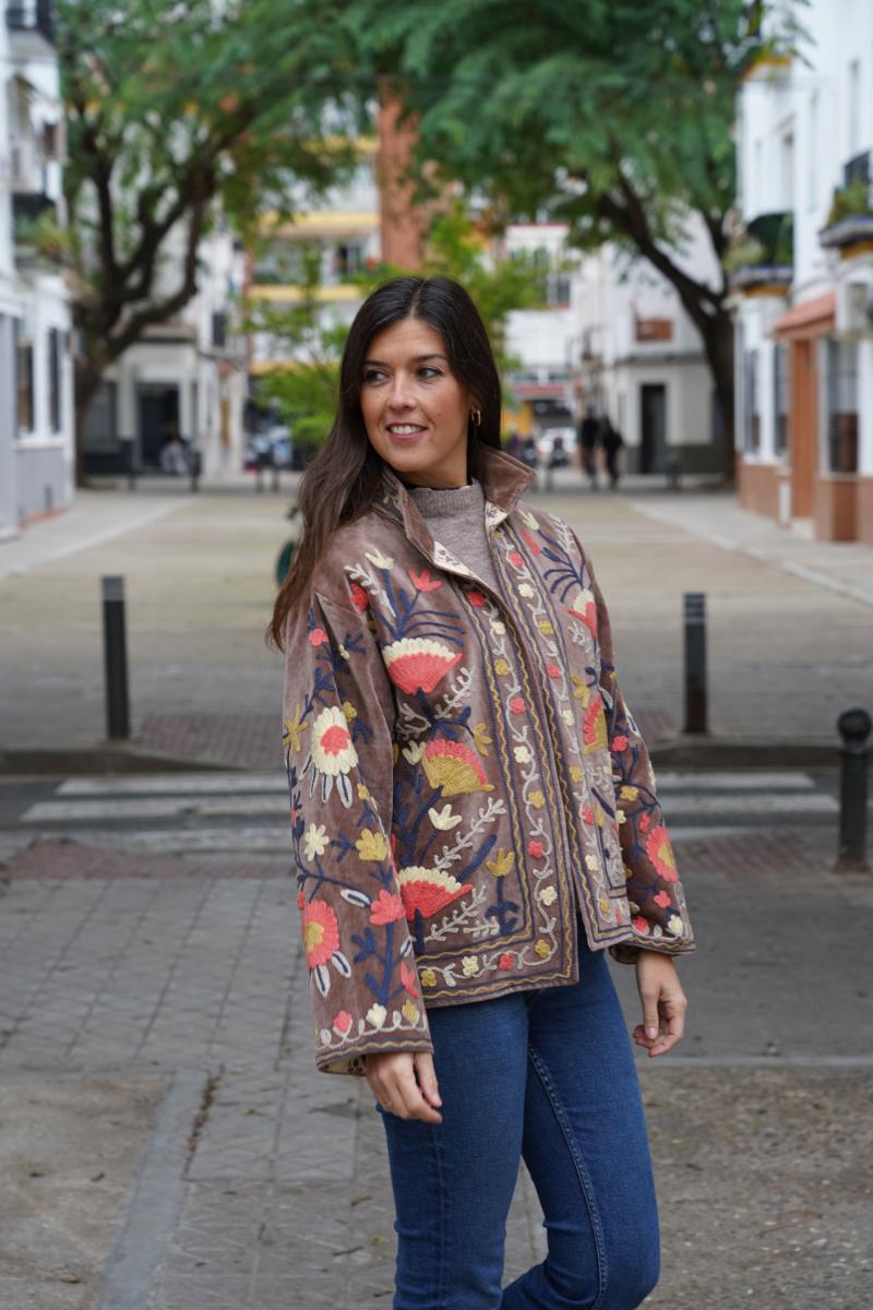 Chaqueta de terciopelo con bordado a mano, interior forrado con estampado block print y detalles florales. Es cómoda, abrigada y con un toque artesanal que marca la diferencia.