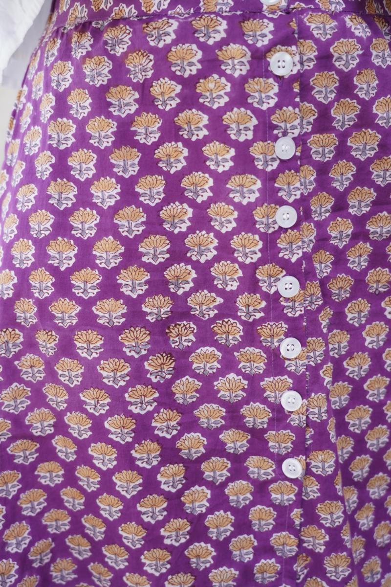 Cada falda está confeccionada por sastres locales con telas estampadas a mano, lo que las hace únicas y especiales. Tienen una caída fluida y un diseño práctico que sienta bien sin marcar.