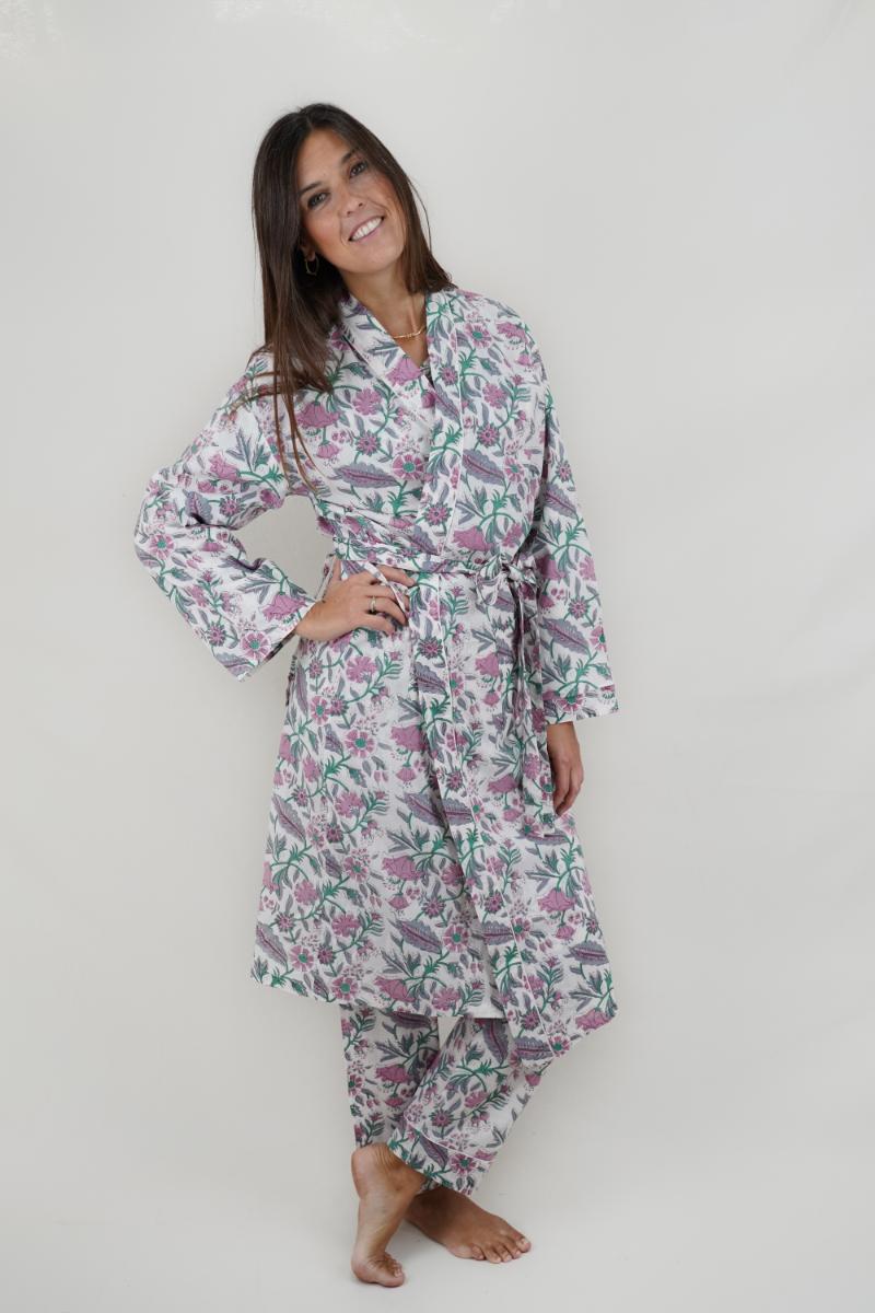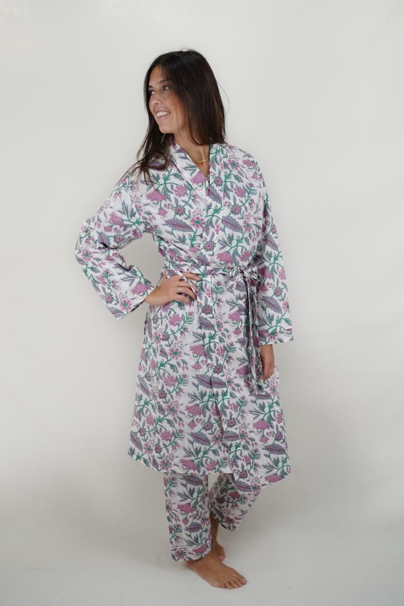 Coloridos kimono de algodón hechos a mano por sastres de la zona de Rajastan, India. Las telas son impresas mediante la técnica del block printing, o sea dar color a textiles utilizando bloques de madera xilografiados. Esta técnica es mundialmente conocida y muy característica de esta región de la India.