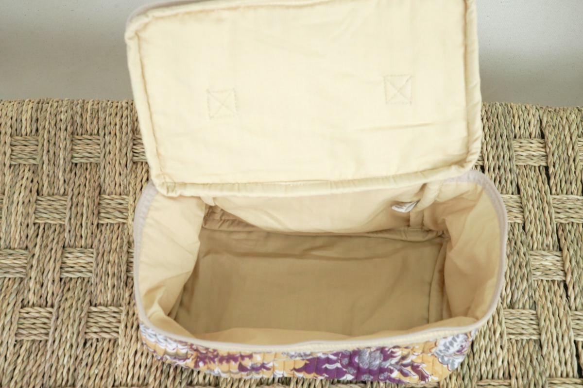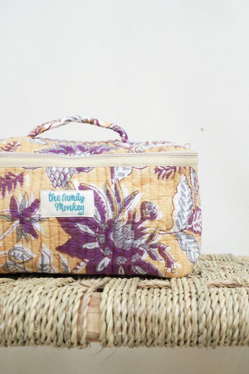 Neceser acolchado con asa – hecho a mano, con forro, cremallera y estampado block print.