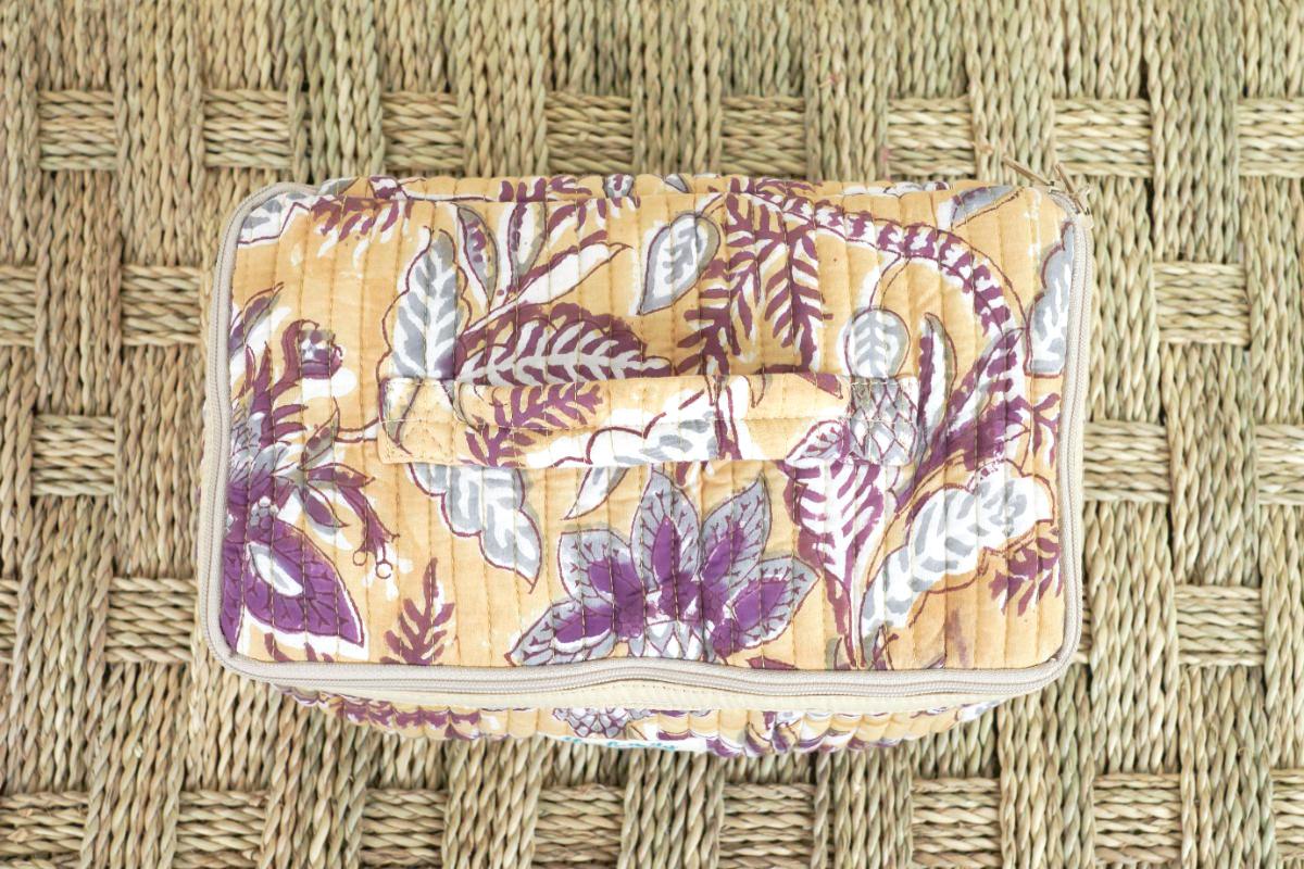 Cada neceser está confeccionado a mano en talleres locales, con telas estampadas artesanalmente con bloques de madera. El acolchado le da cuerpo y protección, y el interior es amplio y cómodo para encontrarlo todo a la primera.