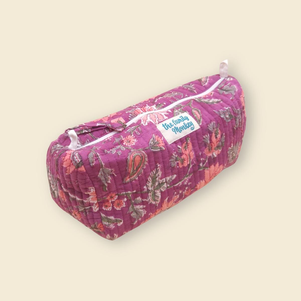 Coloridos neceseres de algodón hechos a mano por sastres de la zona de Rajastan, India. Las telas son impresas mediante la técnica del block printing, o sea dar color a textiles utilizando bloques de madera xilografiados. Esta técnica es mundialmente conocida y muy característica de esta región de la India.