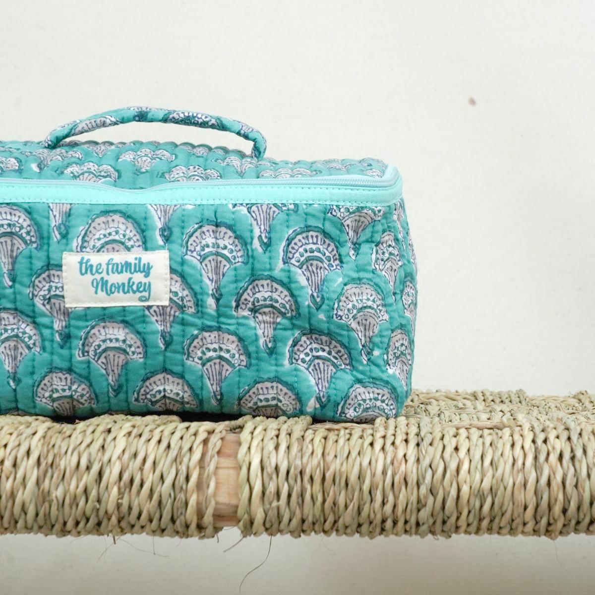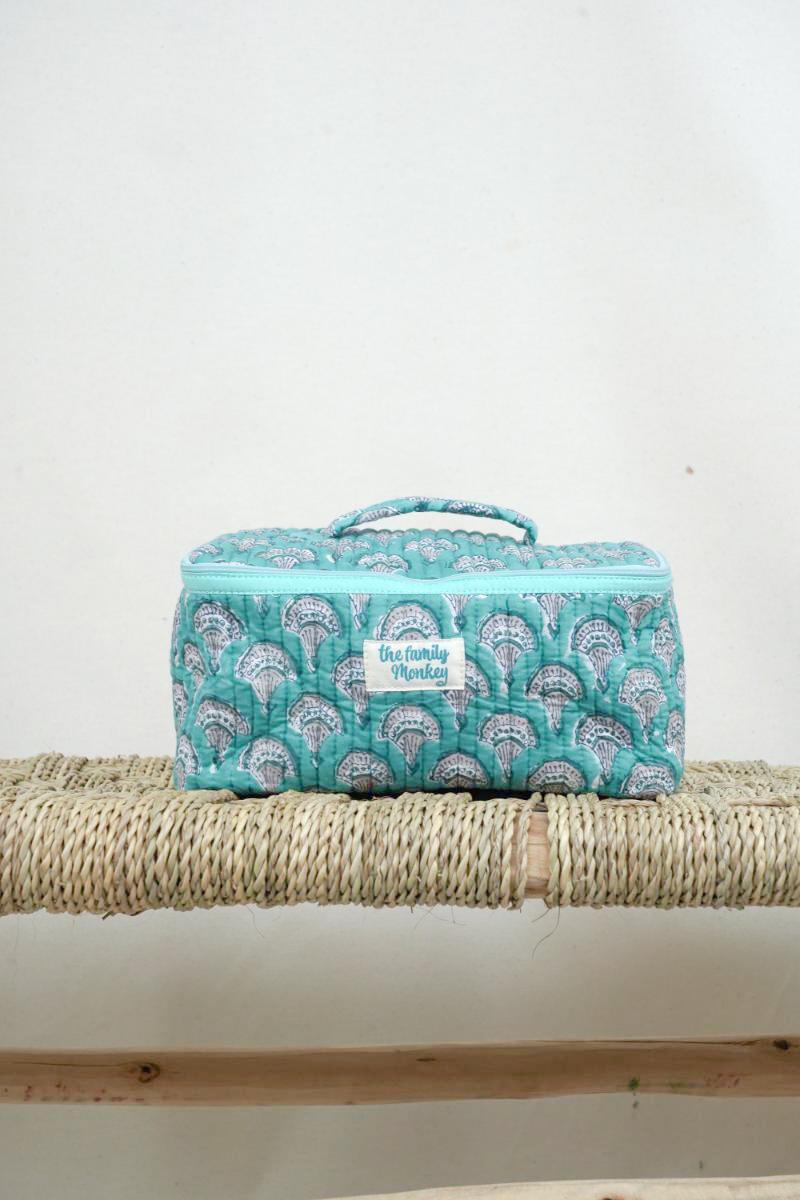 Cada neceser está confeccionado a mano en talleres locales, con telas estampadas artesanalmente con bloques de madera. El acolchado le da cuerpo y protección, y el interior es amplio y cómodo para encontrarlo todo a la primera.