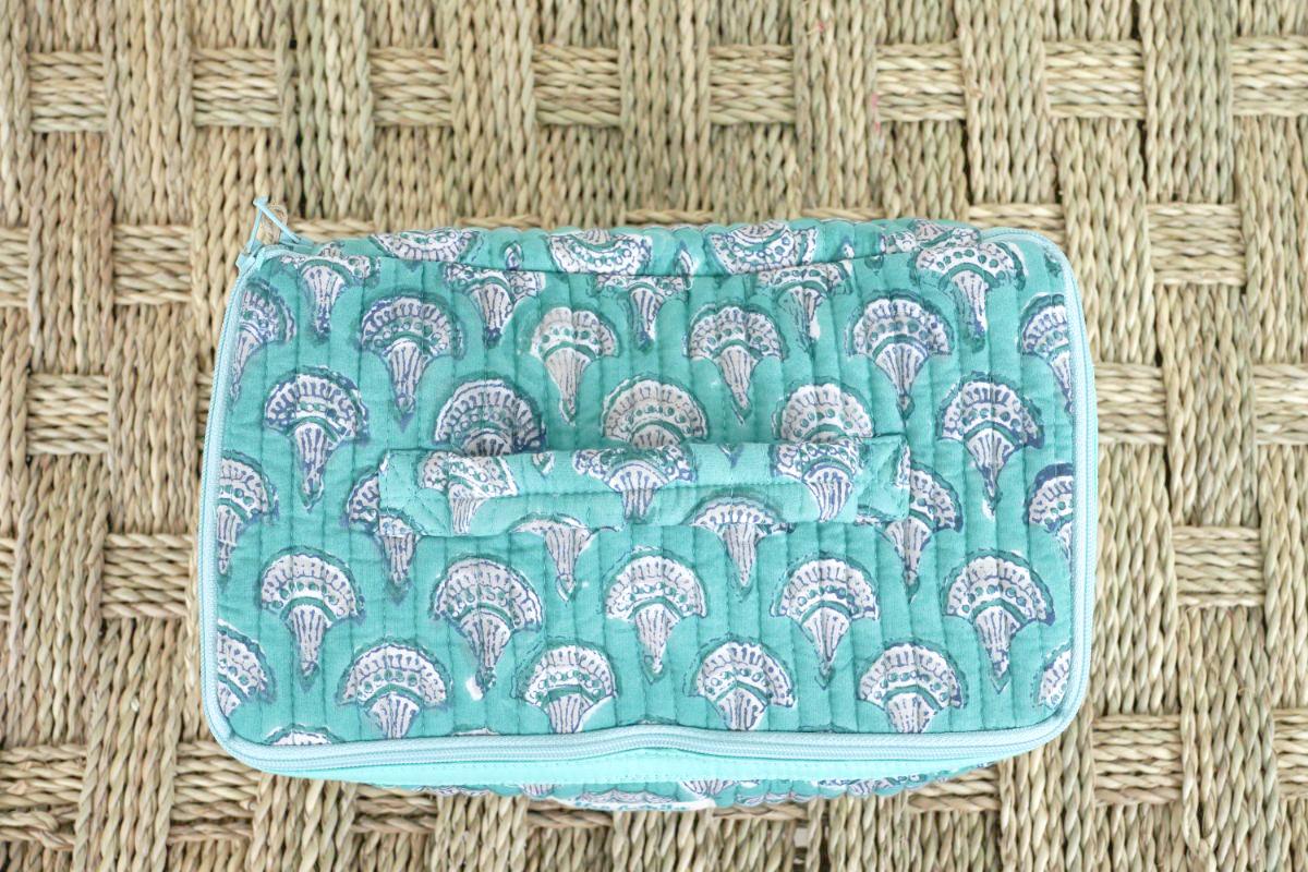 Neceser acolchado con asa – hecho a mano, con forro, cremallera y estampado block print.