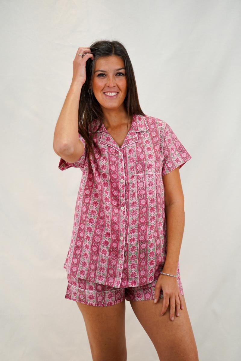Pijama corto de algodón con estampado floral en tonos rosa y verde suave. Un conjunto fresco, cómodo y muy bonito para verano.