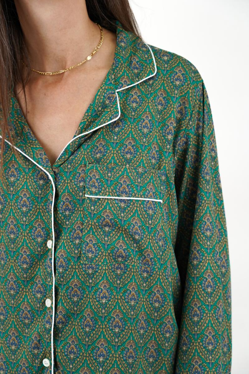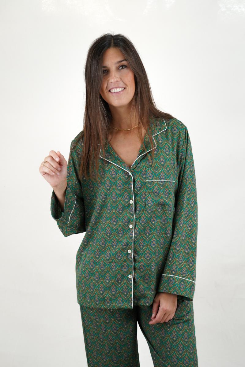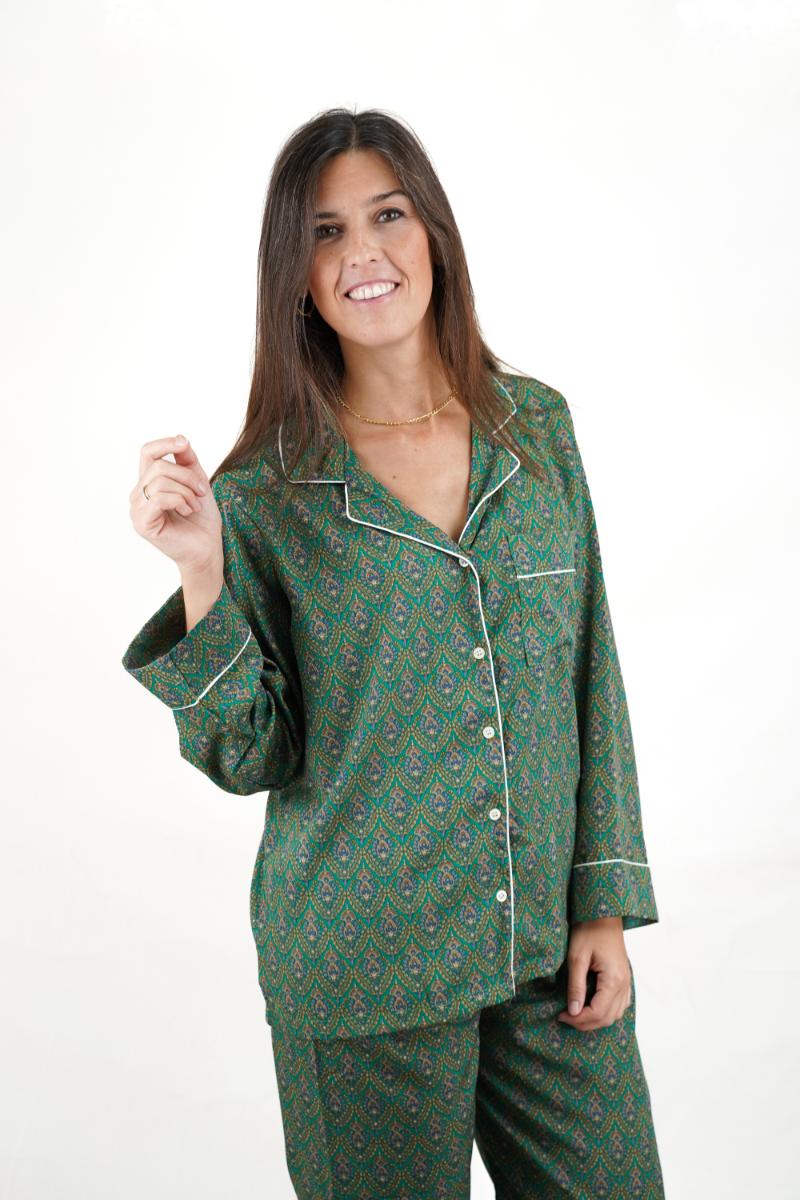 El pijama Lalita está confeccionado en crepé suave con un estampado floral artesanal en tonos verdes y azul. Su caída fluida y su tacto suave aportan una sensación muy agradable. Incluye camisa abotonada y pantalón amplio.- La modelo mide 1.73m y lleva una talla M