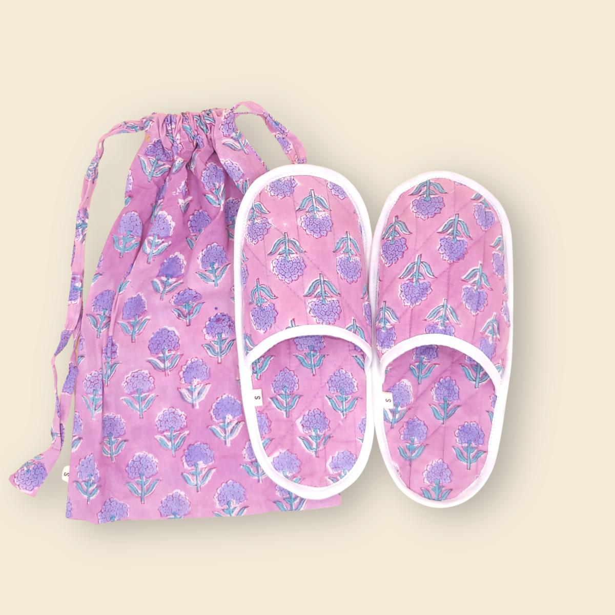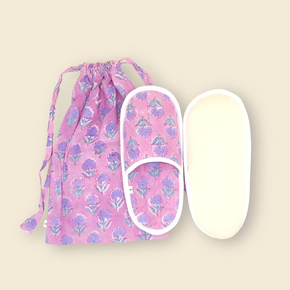 Zapatillas de viaje – ligeras, de algodón, con estampado block print y bolsita a juego.